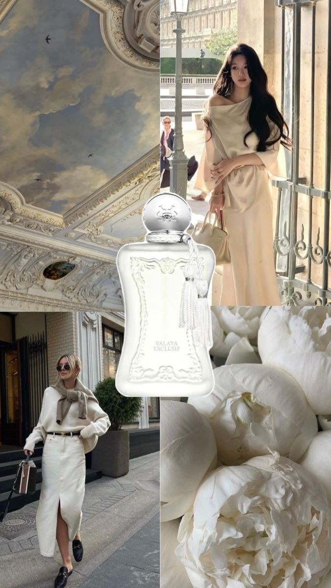 از اسانس های بکار برده شده در این عطر می توان به ترنج ، نارنگی ماندارین، بادام ، شکوفه پرتقال ، گلهای سفید ، روایح پودری، وانیل ، چوب صندل سفید ، آمبروکسان، چوب آکیگالا اشاره کرد.